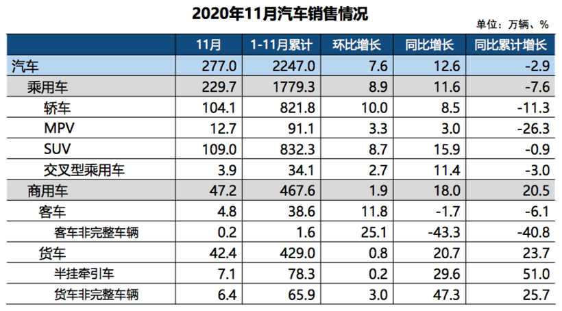 乘用車方面,11月產(chǎn)銷為232.9萬輛和229.7萬輛,環(huán)比增長(zhǎng)11.8%和8.9%,同比增長(zhǎng)7.5%和11.6%,創(chuàng)下年內(nèi)新高。與上月相比,四大類乘用車品種產(chǎn)銷均呈增長(zhǎng);與上年同期相比,多功能乘用車(MPV)產(chǎn)量有所下降,銷量小幅增長(zhǎng),其他乘用車品種產(chǎn)銷繼續(xù)保持增長(zhǎng)。
